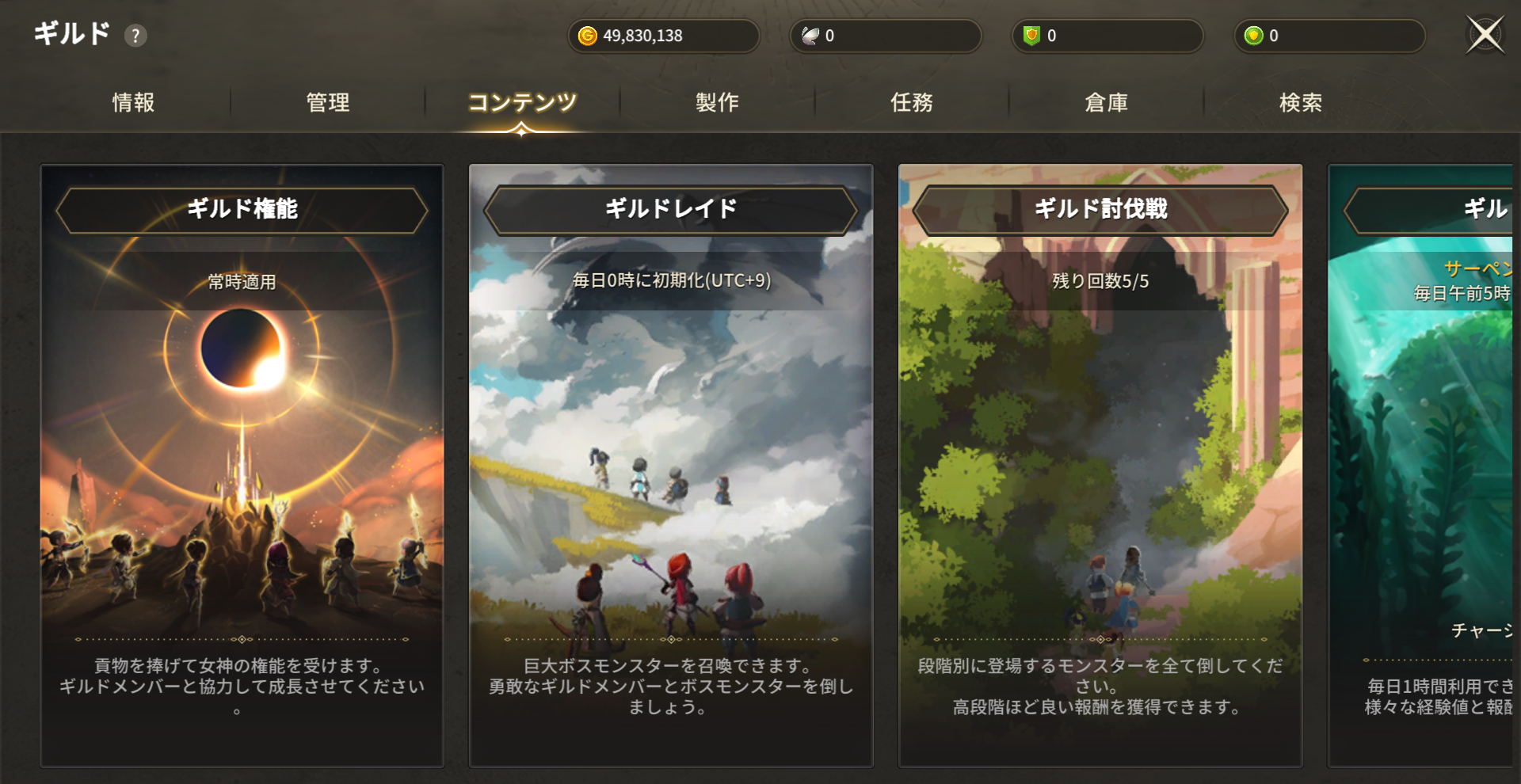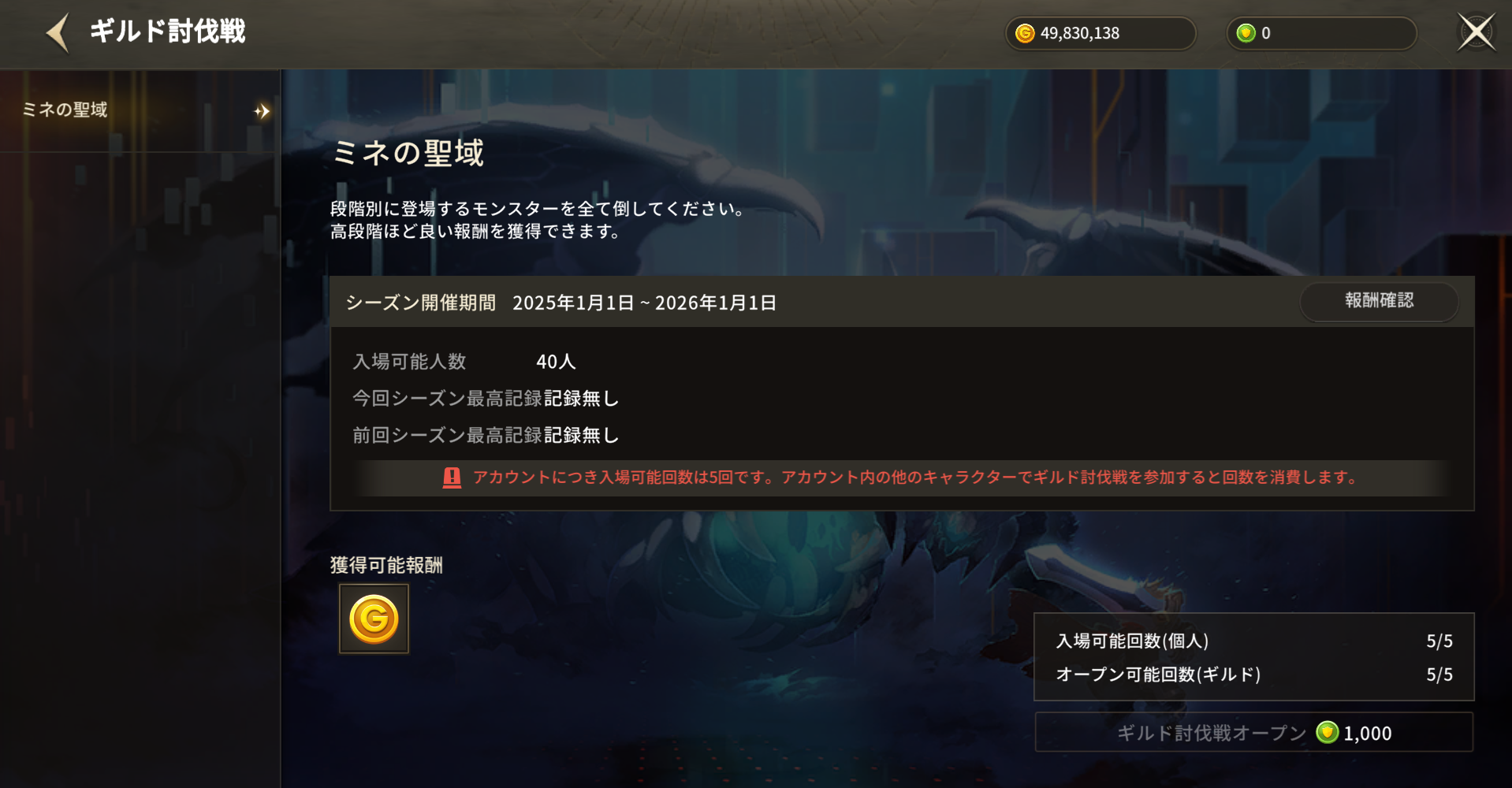 - ギルドコインが不足している場合、ギルド討伐戦を開放できません。