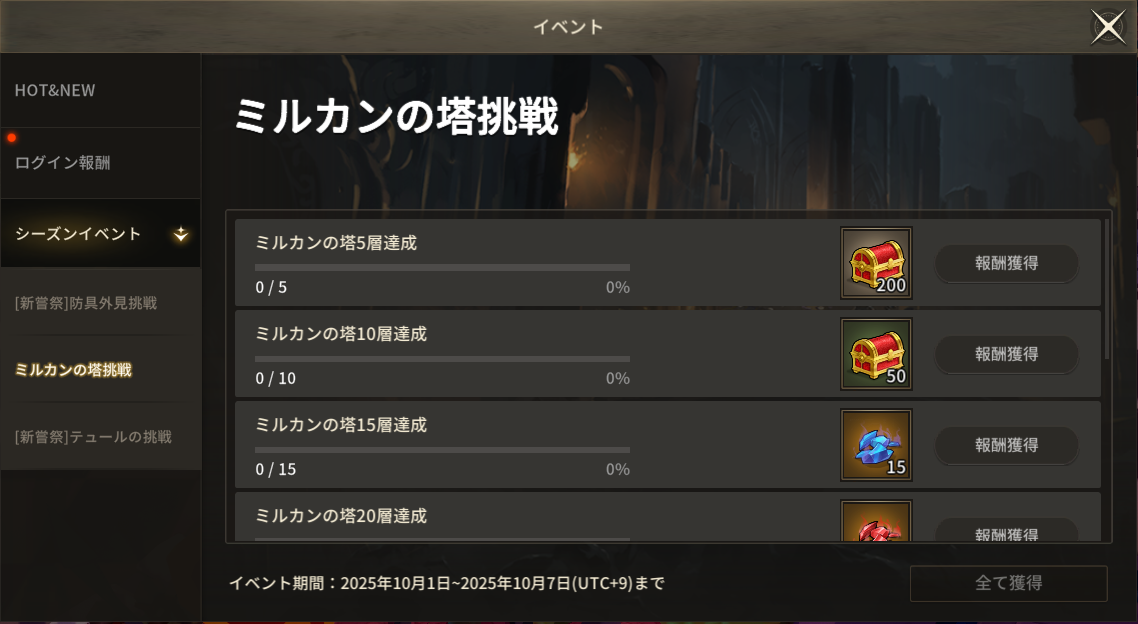 ミルカンの塔15層達成 | ![]() 深淵のオーラの欠片(キャラクター) |