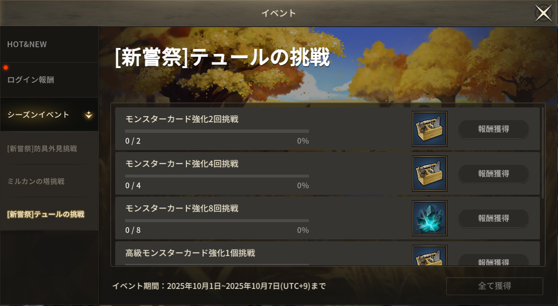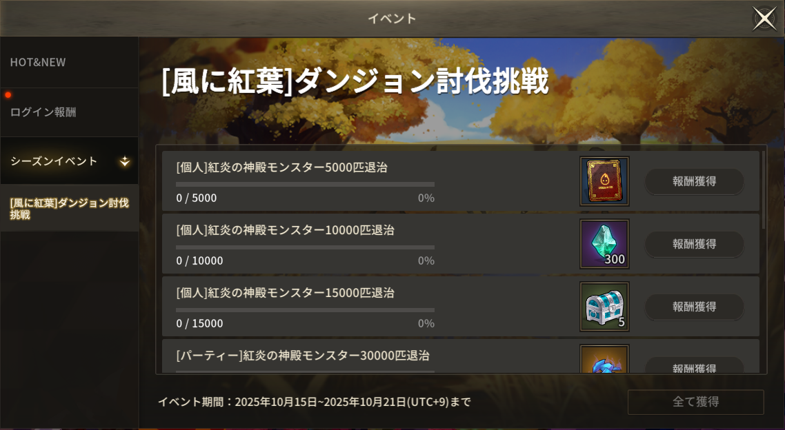 [個人]紅炎の神殿モンスター5,000匹退治 | ![]() 特別なイベントカードパック(キャラクター) |