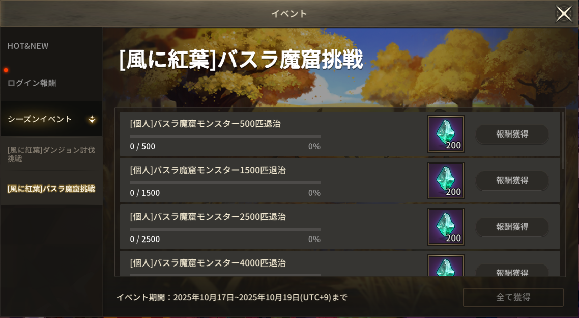 [個人]バスラ魔窟モンスター2,500匹退治 | バタリアンの祝福(キャラクター) | 200 |
