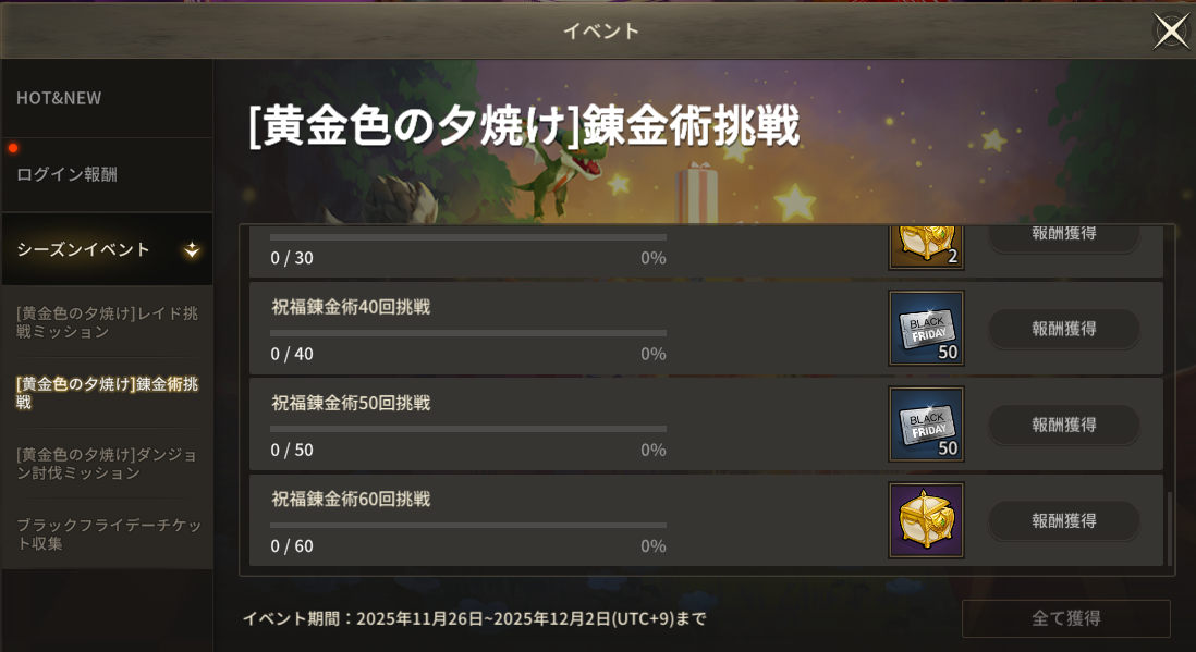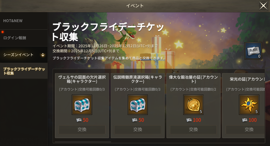 | 祝福錬金術50回挑戦 | ブラックフライデーチケット(キャラクター) | 50 |