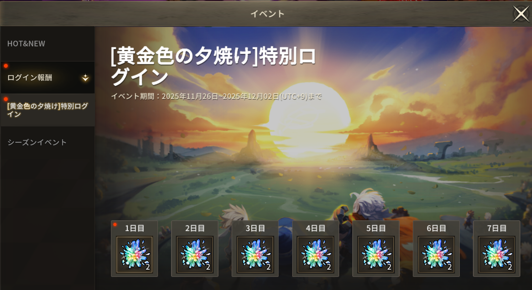 - ゲーム内のイベントページから[黄金色の夕焼け]特別ログインイベントを確認できます。