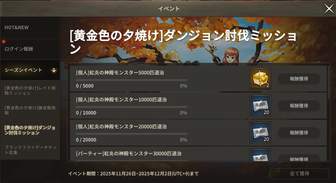 | [パーティー]紅炎の神殿モンスター30,000匹退治 | ブラックフライデーチケット(キャラクター) | 20 |