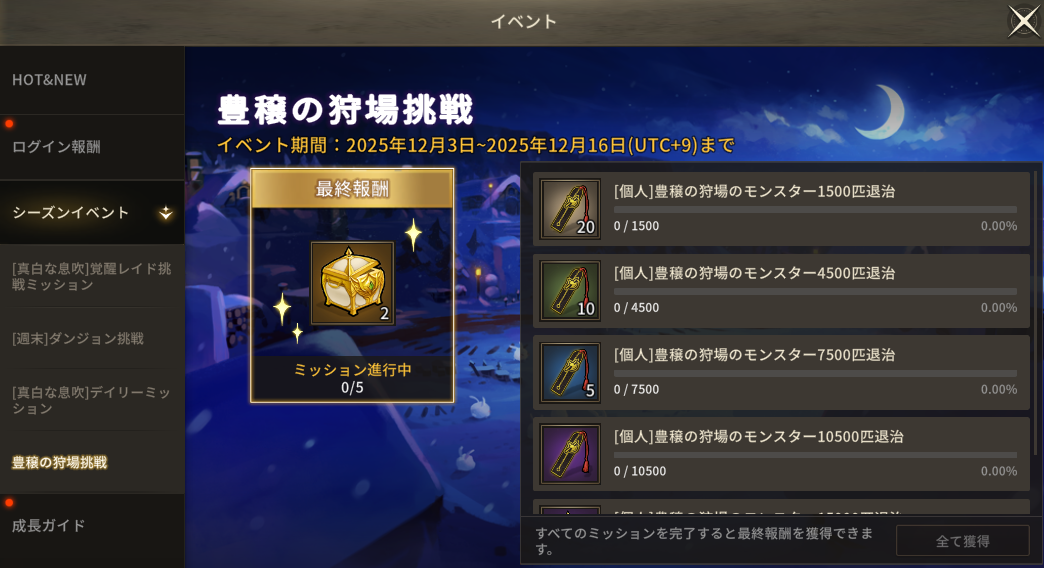 - ゲーム内のイベントページから豊穣の狩場挑戦イベントを確認できます。