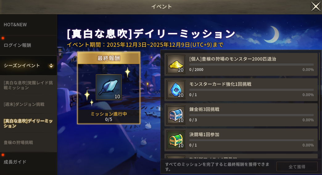 - ゲーム内のイベントページから[真白な息]デイリーミッションイベントを確認できます。
