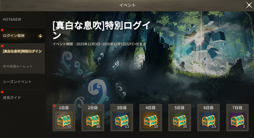 - ゲーム内のイベントページから[真白な息吹]特別ログインイベントを確認できます。