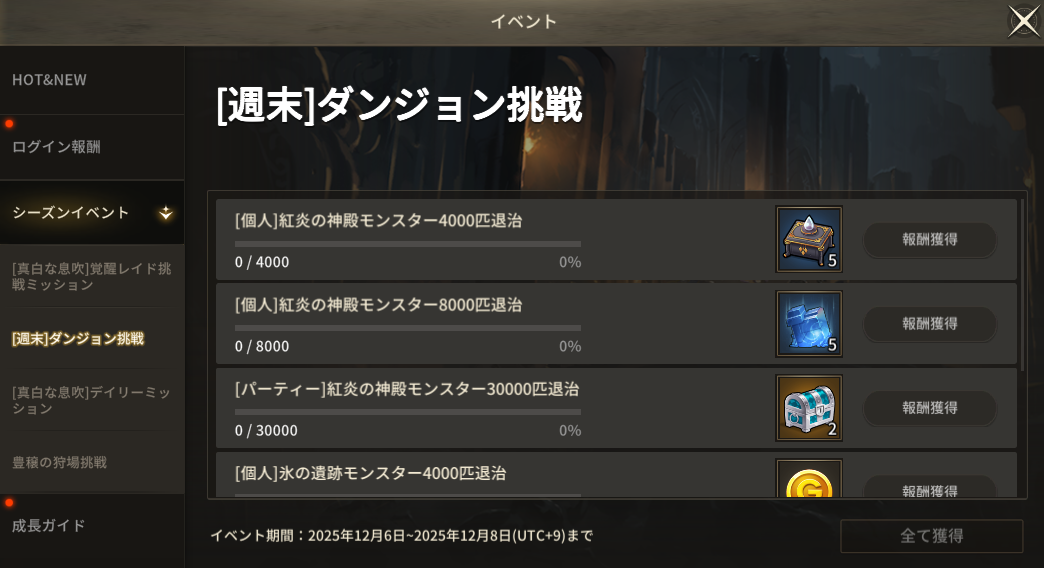 - ゲーム内のイベントページから[週末]ダンジョン挑戦イベントを確認できます。