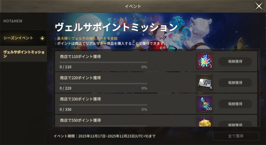 ※ 詳しい内容は[イベント>ヴェルサポイント達成ミッション]からご確認できます。