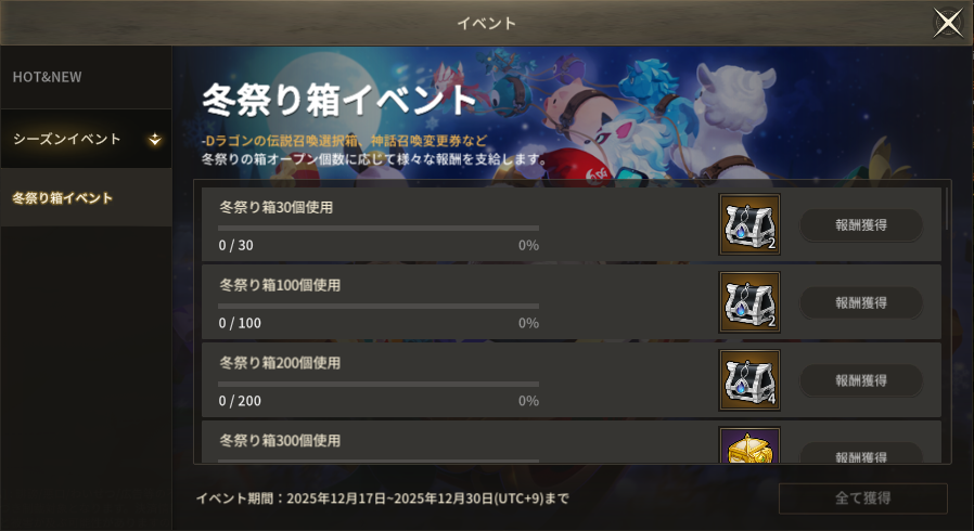 - イベント期間中、冬祭りの箱を使用したら下記の報酬が支給されます。特定個数に到達する度に報酬を獲得します!